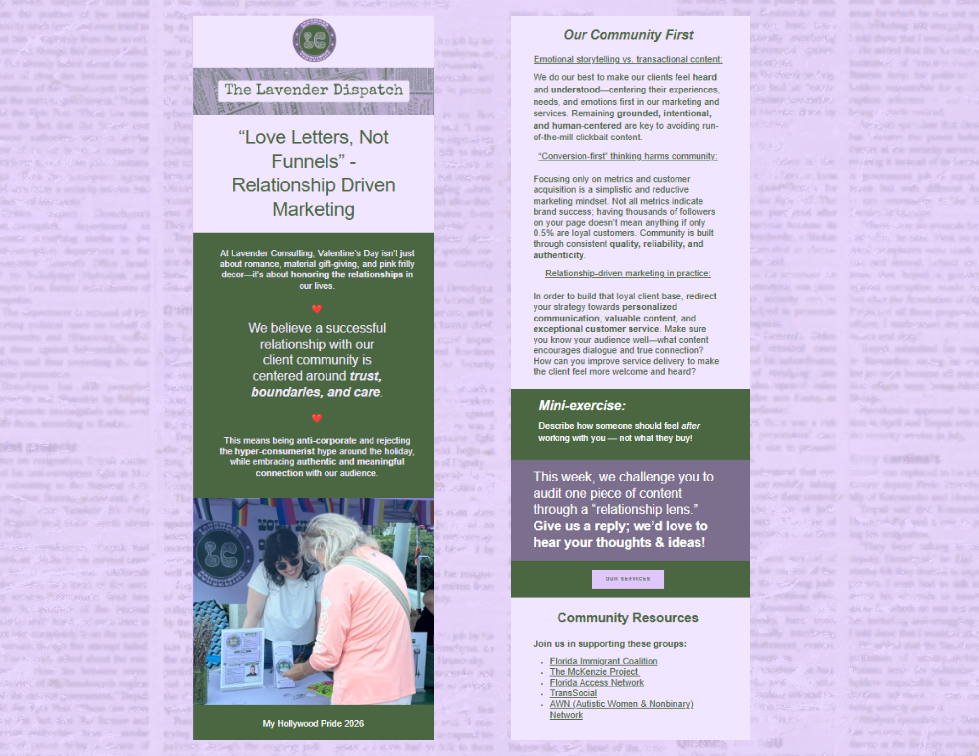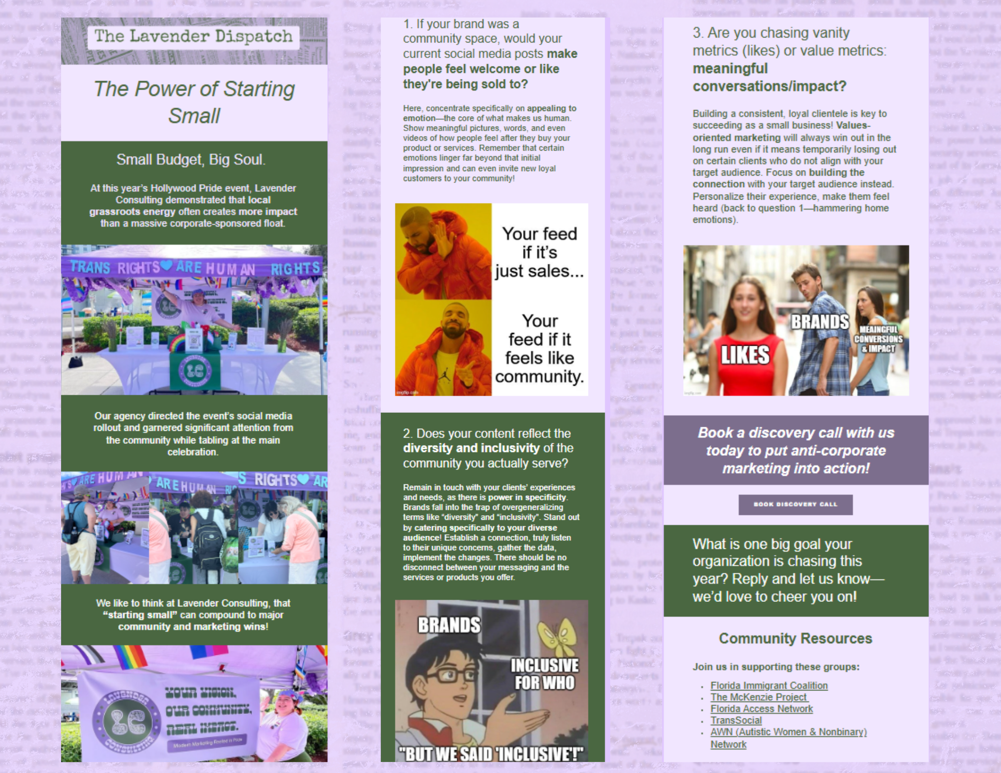 Lavender Consulting is a non-traditional marketing agency offering strategic guidance and creative execution for non profits, queer owned businesses, and values-driven brands that want to grow sustainably while authentically connecting with their audiences.